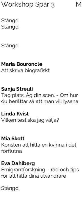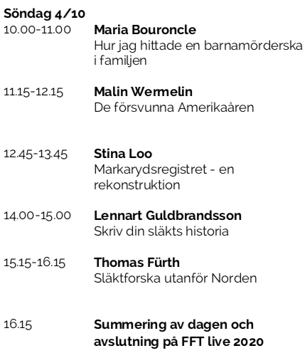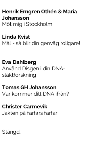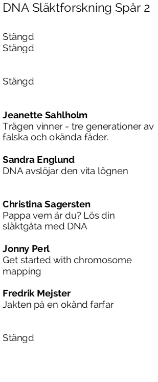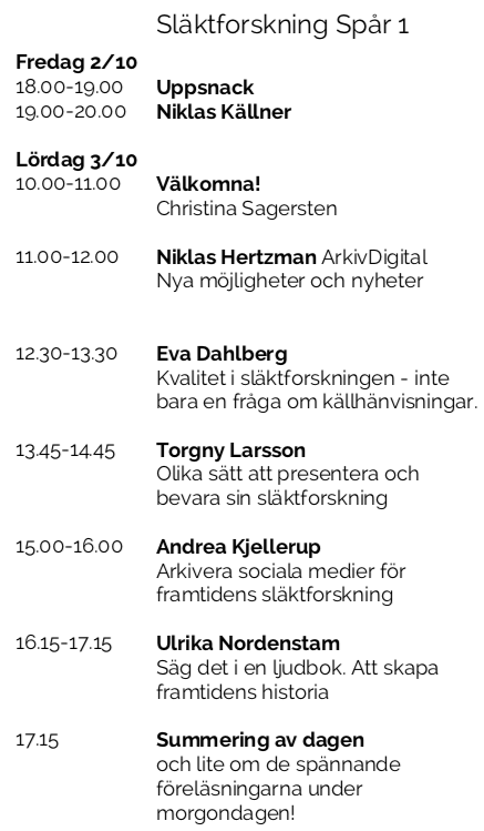 På lördag och söndag har vi delat in programmet i 3 spår - Släktforskning, DNA-släktforskning och Workshops. Passen går parallellt i respektive spår, så vi är medvetna om att det kan vara svårt att välja! Alla pass under lördag och söndag spelas in, så du kan välja att se det du inte hinner med i efterhand. Du har tillgång till inspelningarna under ett år.